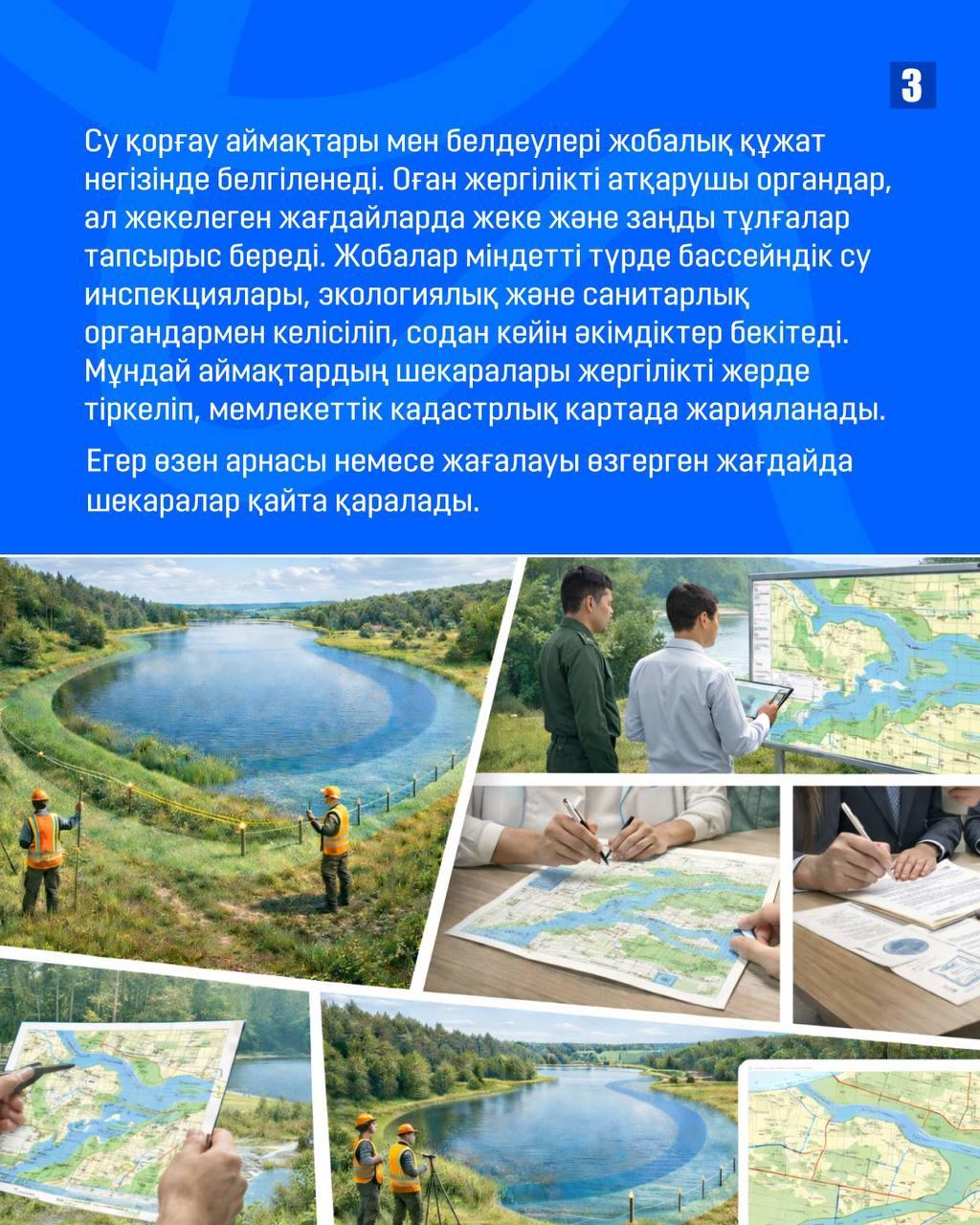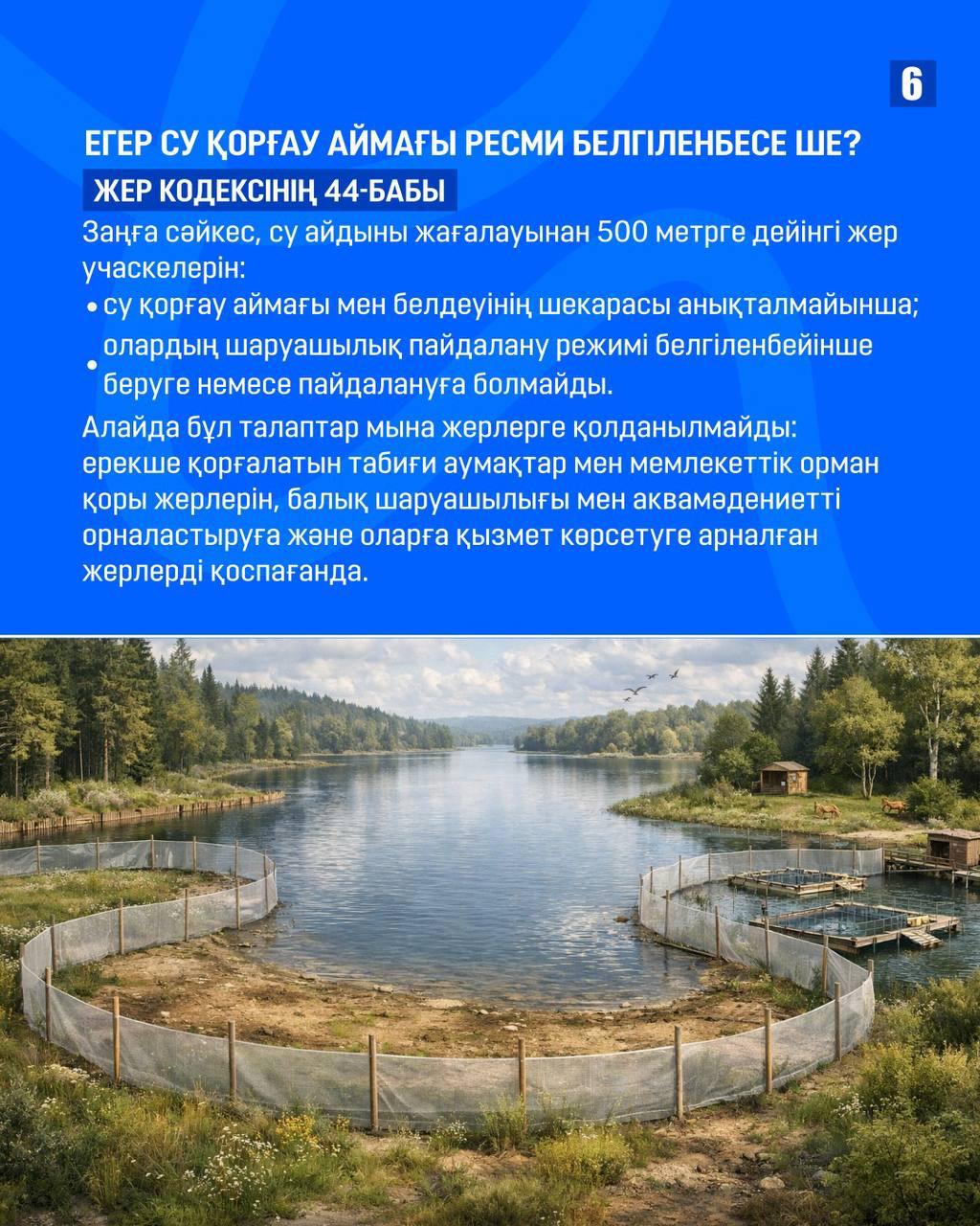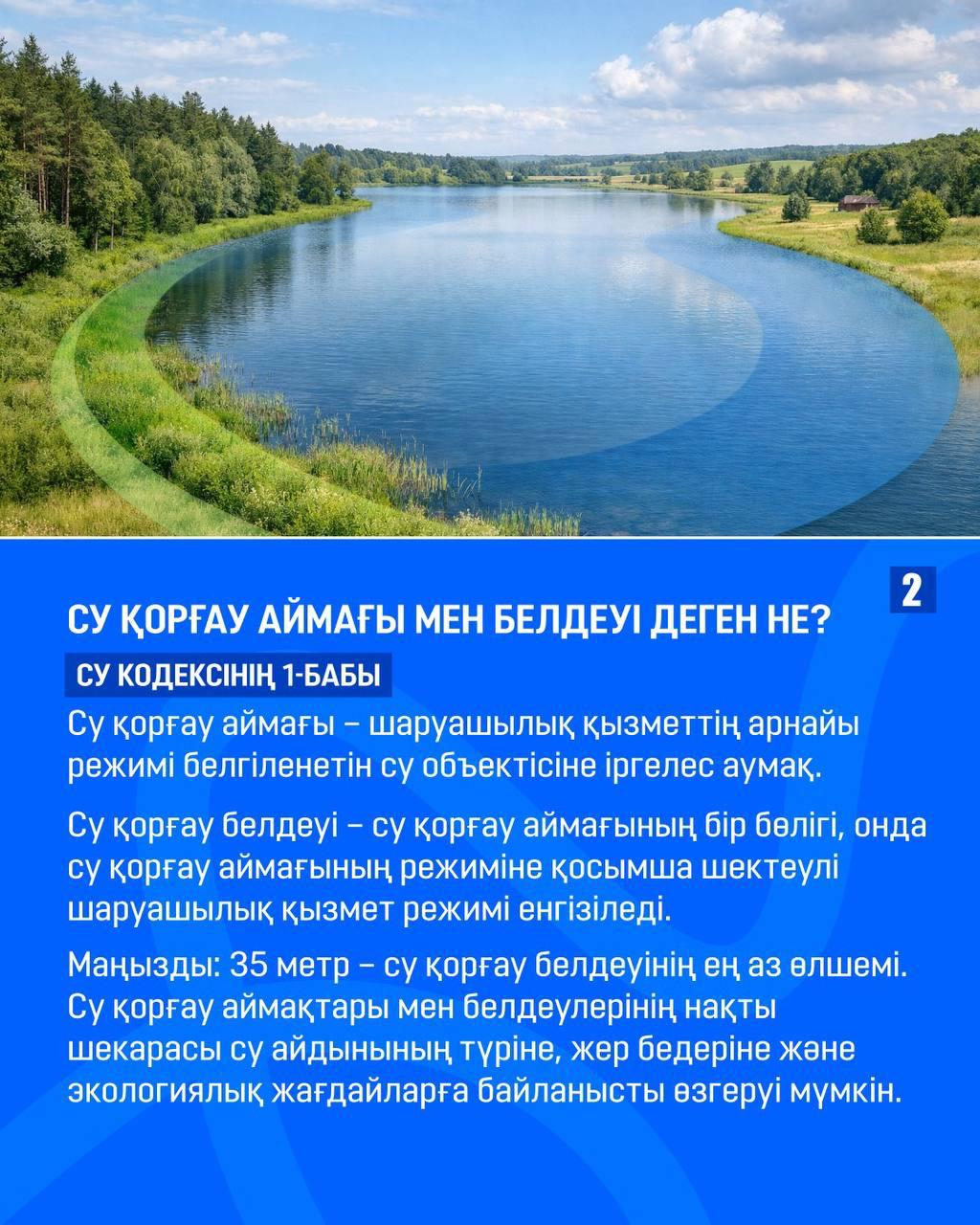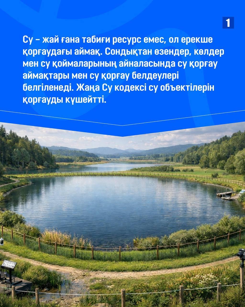 1. Су – жай ғана табиғи ресурс емес, ол ерекше қорғаудағы аймақ. Сондықтан өзендер, көлдер мен су қоймаларының айналасында су қорғау аймақтары мен су қорғау белдеулері белгіленеді. Жаңа Су кодексі су объектілерін қорғауды күшейтті.