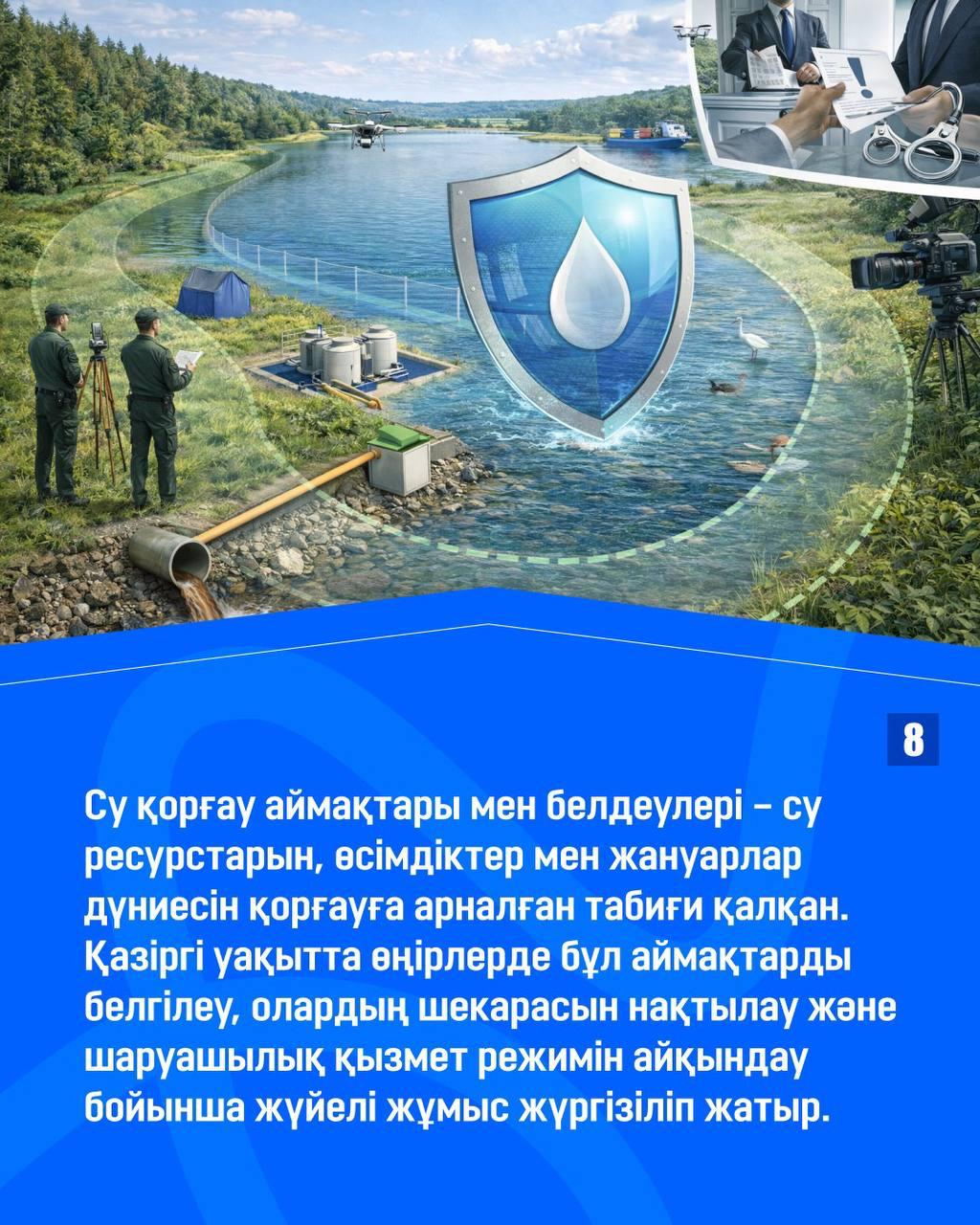 8. Су қорғау аймақтары мен белдеулері – су ресурстарын, өсімдіктер мен жануарлар дүниесін қорғауға арналған табиғи қалқан. Қазіргі уақытта өңірлерде бұл аймақтарды белгілеу, олардың шекарасын нақтылау және шаруашылық қызмет режимін айқындау бойынша жүйелі жұмыс жүргізіліп жатыр.